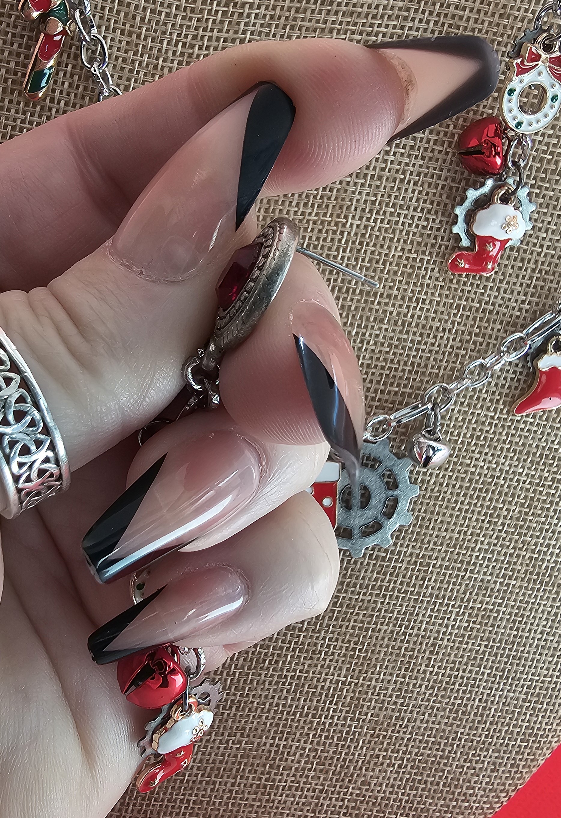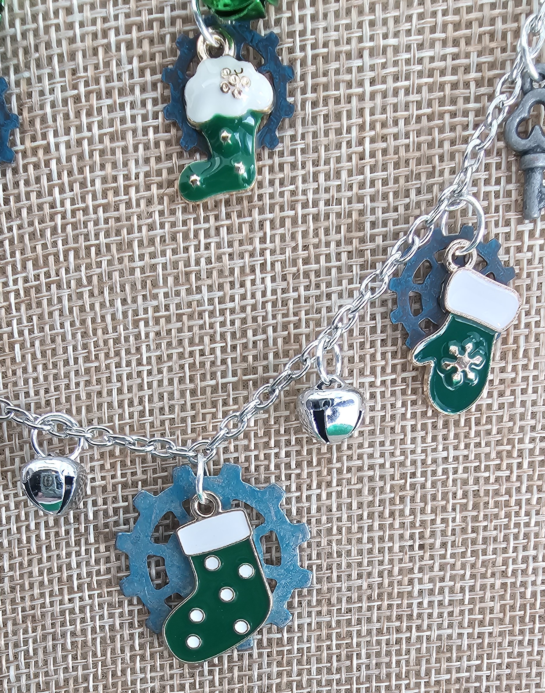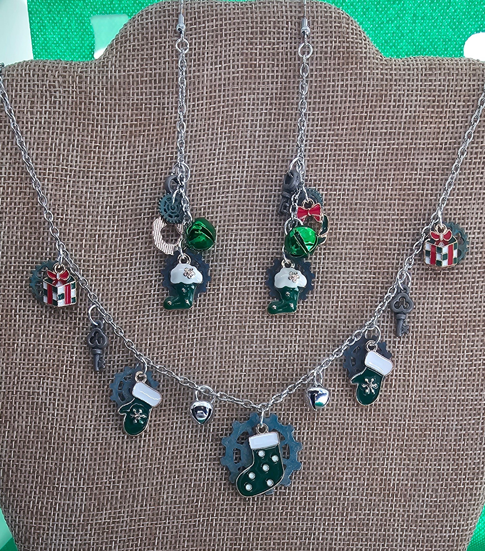 Each set features enamel charms, gears, bells, and chain. Earrings dangle from fishhook earrings, light as a feather! Charms and gears hang from the necklace chain, ensuring it won't turn to display the lobster clasp closure. Show off your holiday spirit in style!